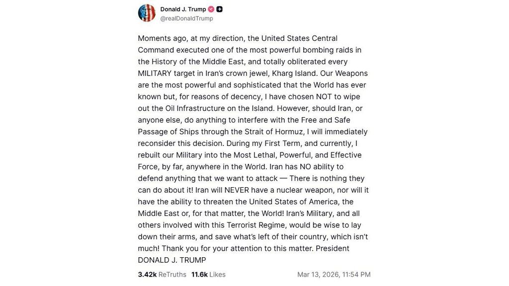 Trump zegt dat de VS het eiland Kharg, het hart van de Iraanse olie-industrie, heeft aangevallen. Volgens de president is daarbij “elk militair doelwit helemaal vernietigd”. Hij zegt “uit fatsoen” de olie-infrastructuur op het Iraanse eiland in de Perzische Golf niet te hebben aangevallen.