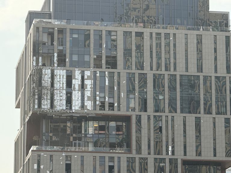 • Het puin beschadigde dit gebouw in Dubai