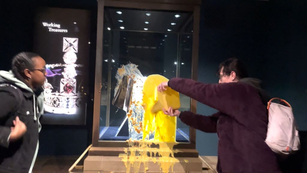 In Londen zijn vier activisten aangehouden vanwege het besmeuren van de vitrine van de Keizerlijke Staatskroon. Op beelden is te zien dat twee jongeren custard en kruimeldeeg tegen het glas gooien. Bezoekers van het museum in de Tower of London reageerden geschrokken.