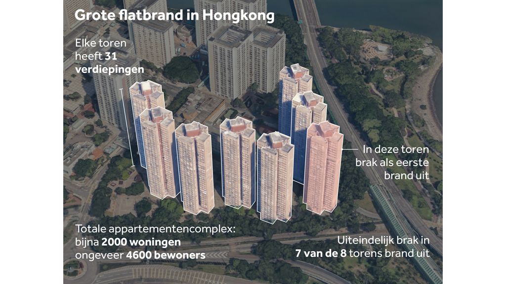 De brand woedde de afgelopen dagen in zeker zeven woontorens van het Wang Fuk Court-complex in de wijk Tai Poi. Inmiddels is het vuur grotendeels geblust, maar in enkele appartementen laaien nog kleine brandhaarden op. Brandweerlieden proberen te voorkomen dat het vuur opnieuw wordt aangewakkerd.
