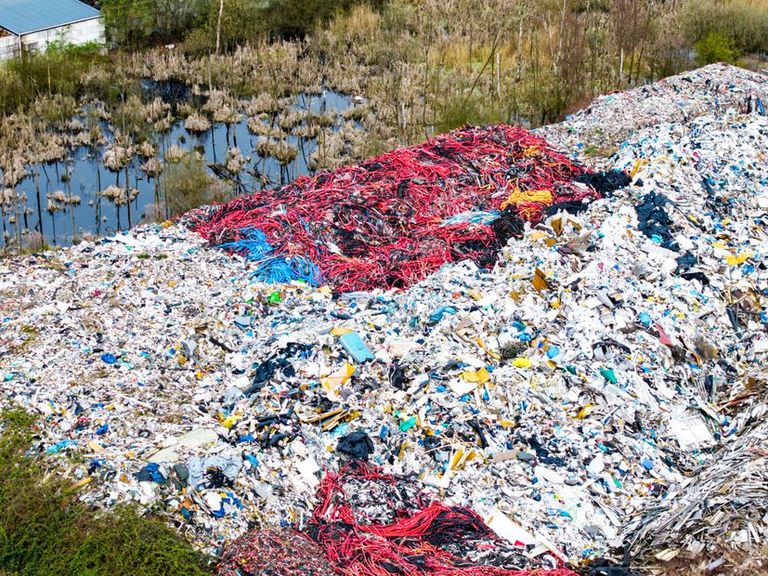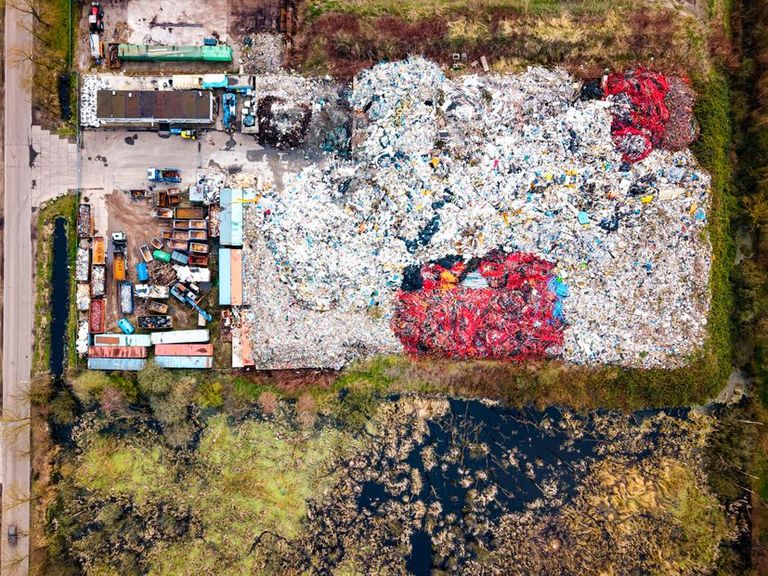 Er liggen grote bulten afval, soms (deels) ingepakt, soms open en bloot. Wat opvalt zijn kapotte trampolines, oude wc-potten en vooral veel schroot, brokken beton en plastic in allerlei soorten en maten.