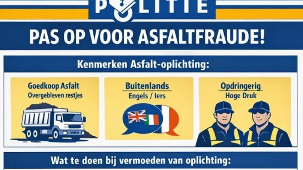 De politie op het Groningse platteland heeft meerdere meldingen binnengekregen en waarschuwt voor de asfaltfraude: “Oplichters gebruiken hoge druk en intimiderende technieken om snel een beslissing te forceren”, schrijven de wijkagenten in Winsum op Instagram. “Ga niet in op het aanbod. Wijs het direct af.”