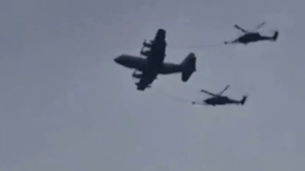 The Washington Post heeft beelden geverifieerd van een vliegtuig en twee helikopters die ergens boven Iran vliegen. Te zien is hoe de helikopters in de lucht worden bijgetankt: