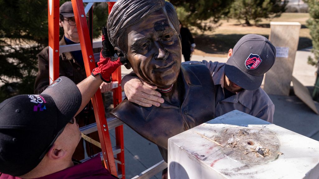 Medewerkers van Denver Arts and Venues verwijderen een buste van César Chávez in Colorado