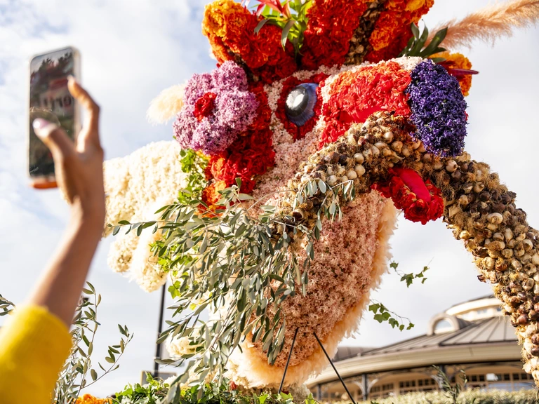 • Met bloemen versierde praalwagens bij het Bloemencorso