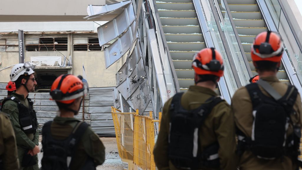Hulpdiensten in de Israëlische plaats Yehud na een Iraanse luchtaanval