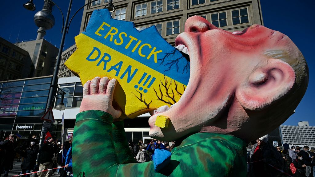 Op een wagen was twee jaar geleden te zien hoe Poetin met wijd opengesperde mond Oekraïne opat met daarbij de tekst: “Erstick dran!” (Stik erin!).