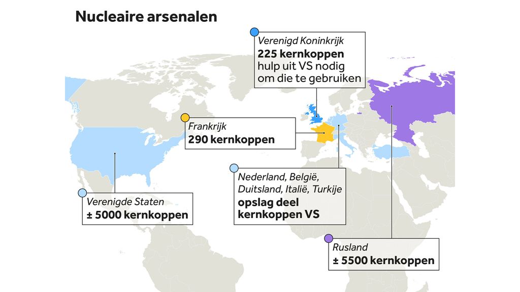 De Duitse bondskanselier Merz voert al gesprekken met Macron over het Franse nucleaire arsenaal, zei hij enkele weken geleden. Eerder sprak hij ook over de optie van Duitse gevechtsvliegtuigen met Franse kernbommen. Vergelijkbare discussies spelen ook in Polen, Zweden en andere landen in het noorden en oosten van de EU. In Nederland schreef de nieuwe regering in het coalitieakkoord dat ons land ‘constructief’ staat tegenover het versterken van Europese nucleaire afschrikking.