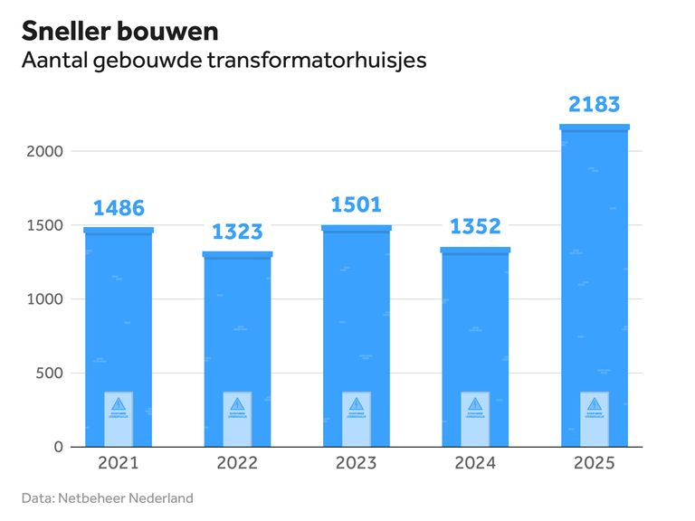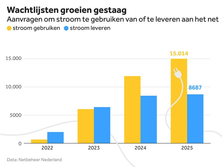 “Voorlopig stijgt de vraag sneller dan wij kunnen bouwen”, zegt Slootweg van Enexis. Hij vreest dat dit op korte termijn erger wordt door de Iran-oorlog. Door de gestegen prijzen van aardgas en olie is het op veel plekken aantrekkelijker om over te schakelen op stroom. “Dat helpt natuurlijk niet om die trend te keren.”