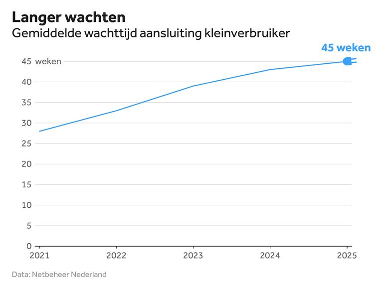 De netbeheerders benadrukken dat instellingen en bedrijven nog altijd een aansluiting krijgen. Alleen kwamen er vorig jaar nog meer aanvragen binnen, waardoor de wachttijden verder zijn opgelopen. Kleinverbruikers, zoals huishoudens, wachten gemiddeld 45 weken op een nieuwe aansluiting en 21 weken op uitbreiding.
