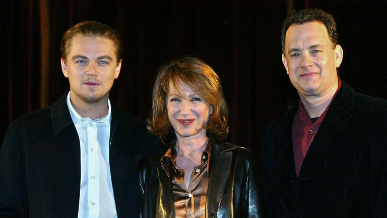 Baye met Leonardo DiCaprio (l) en Tom Hanks (r) tijdens de perspresentatie van Catch me if you can, in 2003