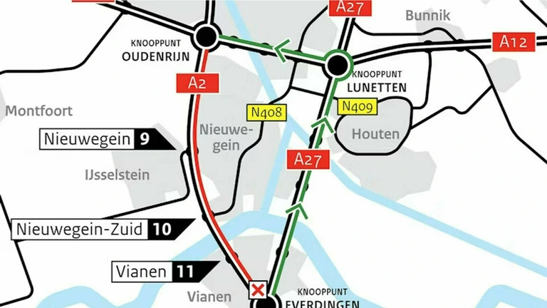 Rijkswaterstaat roept weggebruikers vanwege de werkzaamheden aan de A2 bij Vianen dit weekend met klem op niet af te wijken van de omleidingsroute. De afgelopen twee weekenden liep het verkeer in Vianen en andere omliggende plaatsen vast door sluipverkeer.