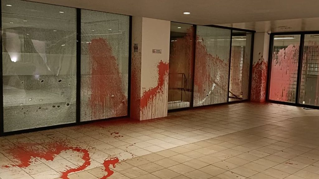 Rode verf en ingeslagen ruiten bij het kantoor van Maersk