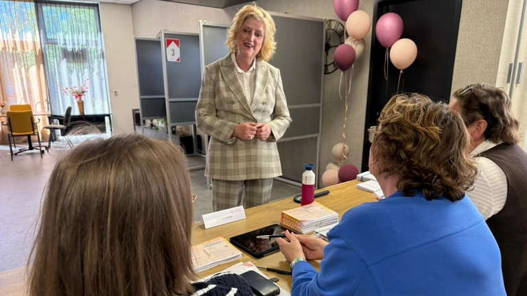 Burgemeester Reinie Melissant laat zich bij stembureau Rozenobel bijpraten