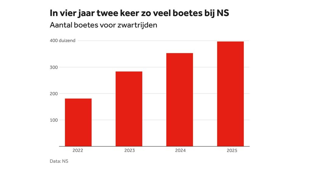 De NS schrijft steeds vaker bekeuringen uit. In 2024 werden ruim 350.000 mensen zonder kaartje beboet. De cijfers van vorig jaar zijn nog niet gepubliceerd, maar de spoorwegen schatten dat het zo’n 400.000 boetes waren. Daarbij moet aangetekend dat het aantal reizigers in 2022 veel lager lag vanwege corona, en het aantal controles per jaar wisselt.