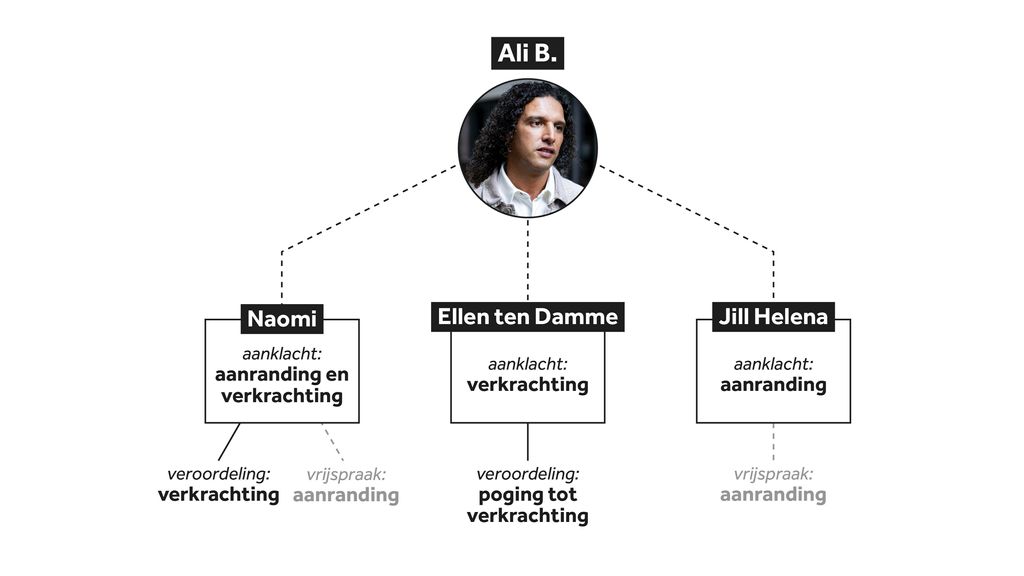 Niet voor alle ten laste gelegde delicten werd de artiest veroordeeld. Zo was volgens de rechter niet onomstotelijk vast komen te staan dat Ali B zangeres Ellen ten Damme had verkracht. Een poging tot verkrachting achtte de rechter wel bewezen. Daarnaast werd Ali B vrijgesproken van twee aanrandingen.
