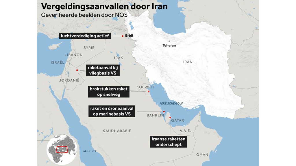 Iran reageerde op de aanvallen door Israël en de VS met vergeldingsaanvallen. Op basis van beelden die door de NOS zijn geverifieerd, zijn ten minste de locaties op onderstaand kaartje aangevallen.