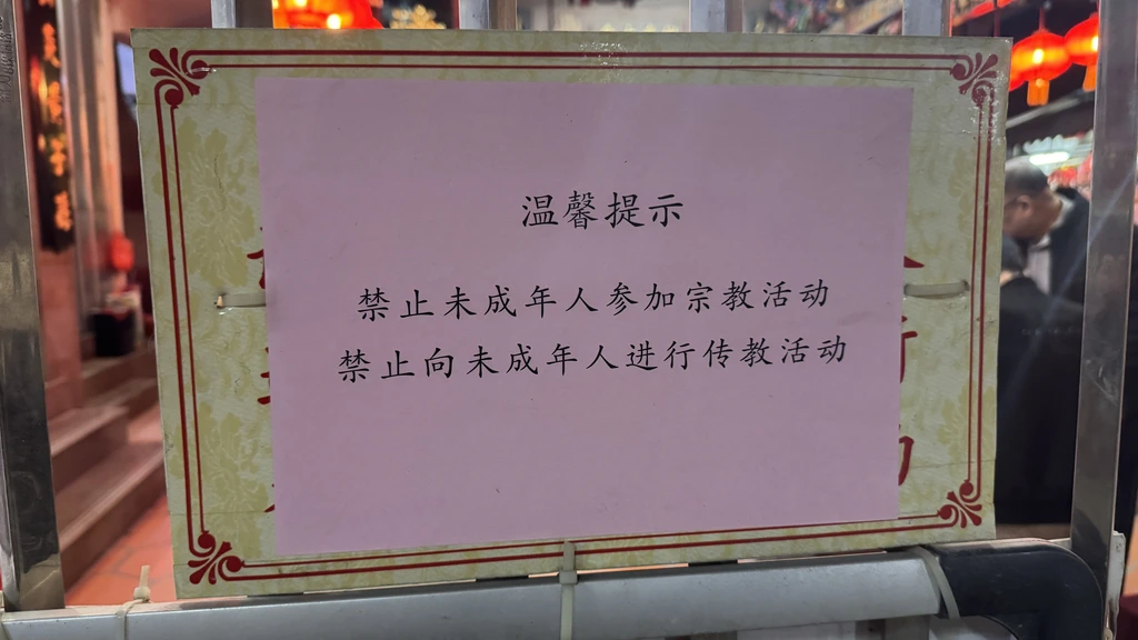 Het zijn niet alleen katholieke kerken waarvan kinderen worden geweerd door de autoriteiten. Bij een boeddhistische tempel in de Zuid-Chinese stad Jieyang hing rond Chinees Nieuwjaar dit bordje: