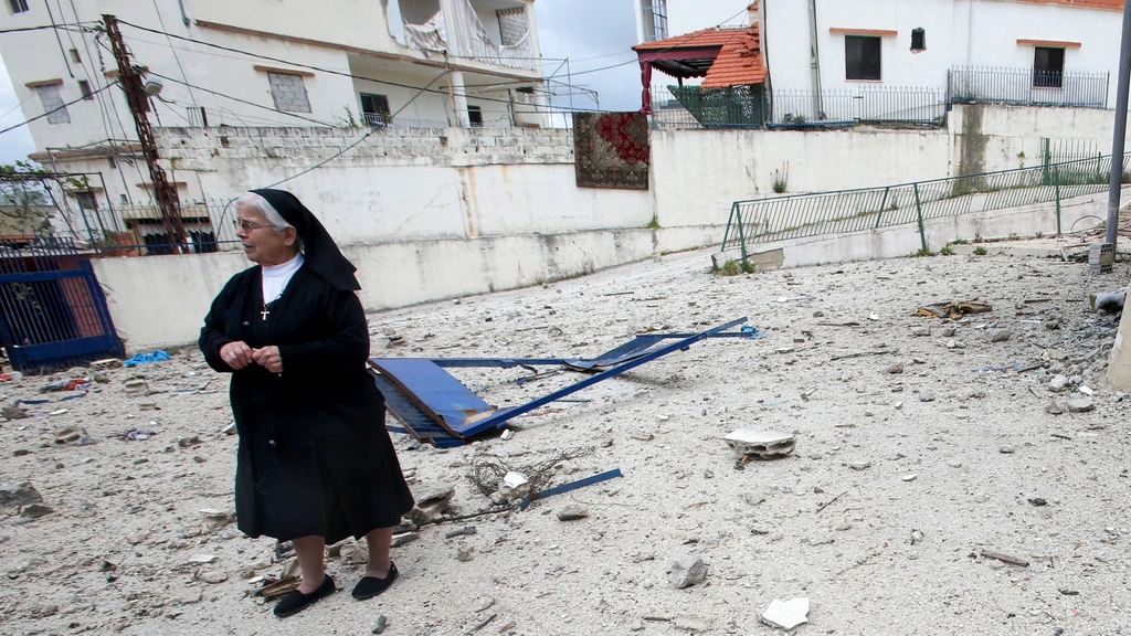 Een non op het beschadigde plein van een school voor nonnen in de Libanese stad Nabatiye