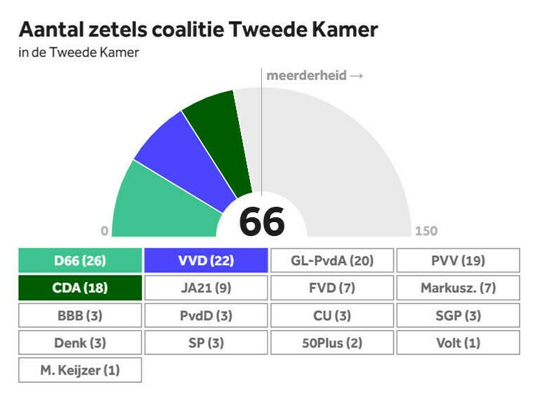 Bikker: “Uiteindelijk heeft het kabinet een gat.” Dat gat is het verschil tussen de 66 Tweede Kamerzetels van de drie regeringspartijen en de 76 zetels die nodig zijn voor een Kamermeerderheid. Ook in de Eerste Kamer heeft de coalitie geen meerderheid.