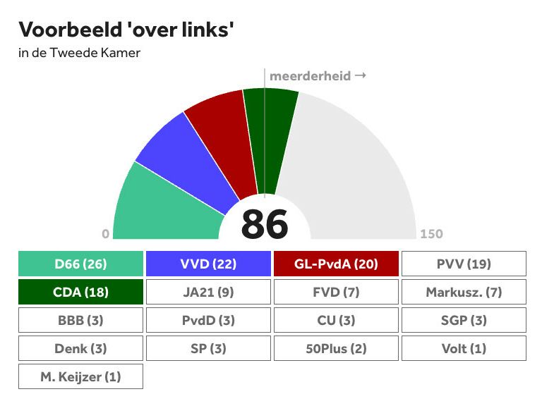 Voor de regeringspartijen D66, VVD en CDA betekent ‘over links’ met de 20 zetels van GL-PvdA een meerderheid van 86 zetels. Dat is riant, maar de inhoudelijke verschillen leveren wel een puzzel op.