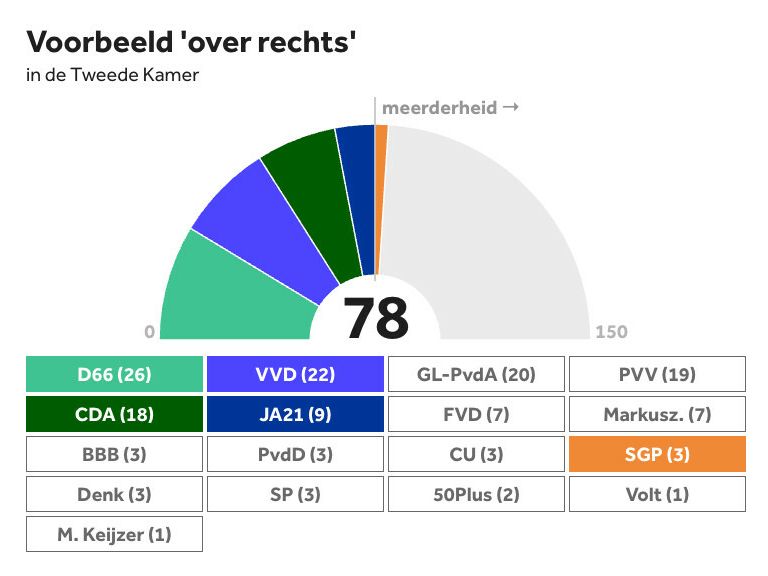Ook ‘over rechts’ is er zo’n puzzel, maar die is meer getalsmatig van aard. Daarvoor is naast de steun van de drie coalitiepartijen steun van minstens twee andere partijen nodig, bijvoorbeeld SGP met JA21 of Groep Markuszower.