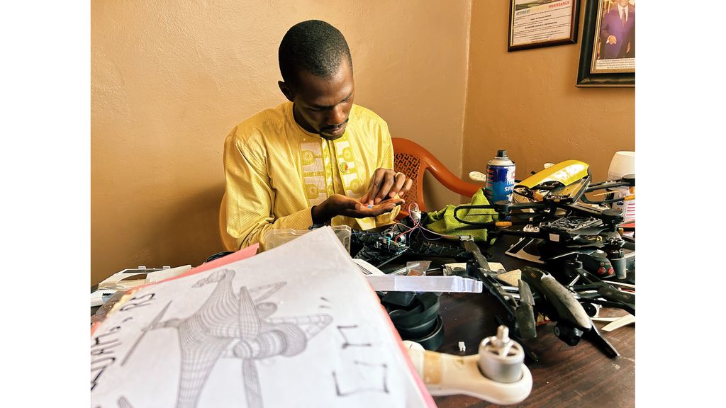 Op zijn tafel liggen opengeschroefde drones, gereedschap en gekleurde elektriciteitsdraden. Diarra wordt in eigen land geroemd om zijn kennis over drones: de afgelopen jaren bouwde hij meer dan honderd exemplaren voor het leger en de politie. Deze worden ingezet voor patrouilles.
