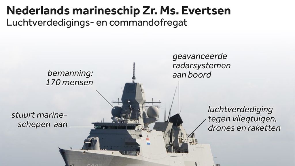 Nederland stuurt het luchtverdedigings- en commandofregat Zr. Ms. Evertsen naar het oosten van de Middellandse Zee om mee te helpen met het beschermen van landen in de regio tegen Iraanse aanvallen. Dat schrijft het kabinet in een brief aan de Tweede Kamer. Frankrijk heeft om deze hulp gevraagd. De afgelopen dagen zijn er afspraken gemaakt over de details van de opdracht.