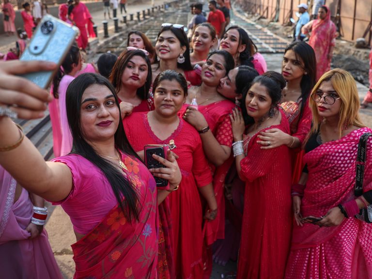 Transgenders maken selfies bij de Pink Rally die de gemeenschap begin 2025 organiseerde in Mumbai -