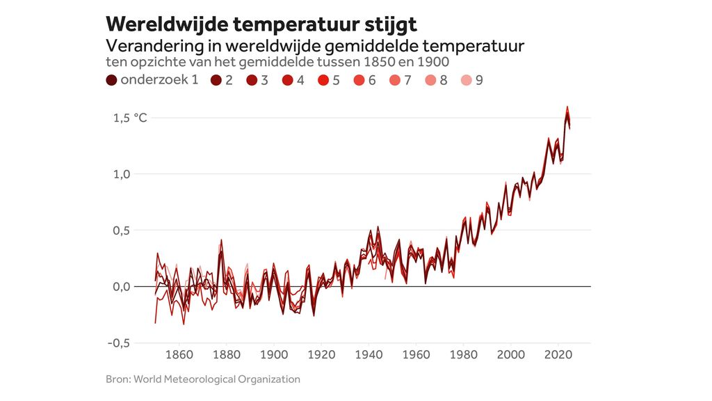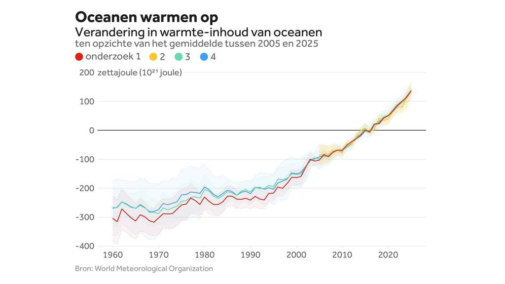 Het klimaat op aarde is meer uit balans dan ooit is waargenomen, stelt de Wereld Meteorologische Organisatie (WMO) in een jaarlijks rapport. Wetenschappers meten hoeveel warmte de aarde opneemt én weer afgeeft. Nog niet eerder zagen zij dat de aarde zoveel warmte vasthield als in 2025. Sommige van de negatieve gevolgen daarvan, bijvoorbeeld op oceanen, zullen nog honderden jaren – potentieel zelfs duizenden – merkbaar zijn.
