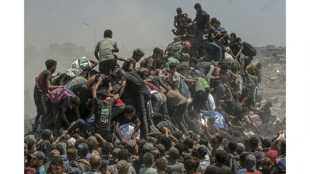 Palestijnen proberen aan eten te komen bij een vrachtwagen met noodhulp -