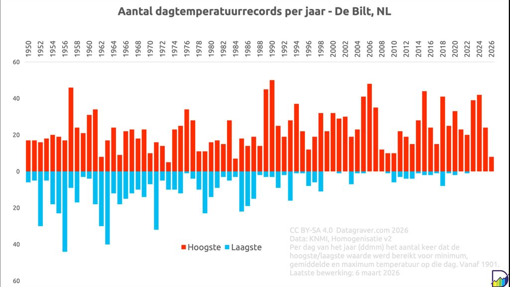 De afgelopen vijf jaar sneuvelden er ruim 120 keer dagrecords voor de hoogst gemeten temperatuur. Slechts één keer werd een record voor een laagstgemeten temperatuur gebroken, op 18 september 2022.