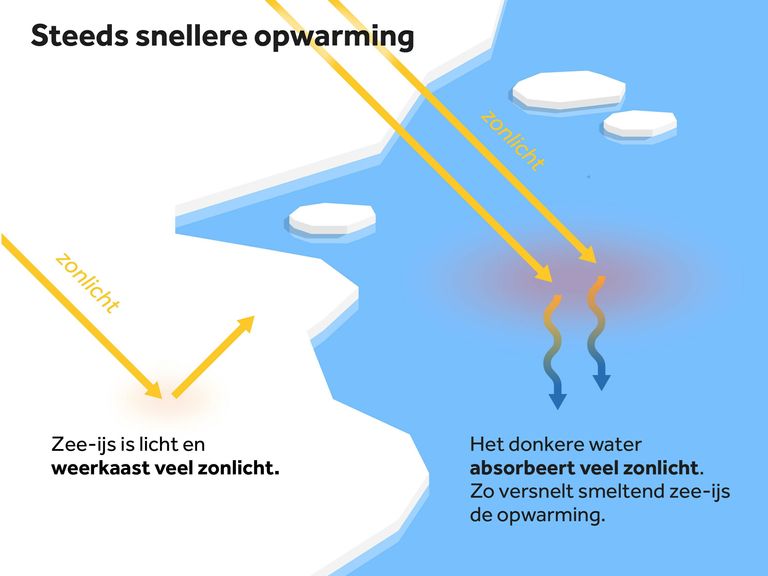 Schematische weergave hoe smelten van het zee-ijs de opwarming van het Noordpoolgebied versnelt -