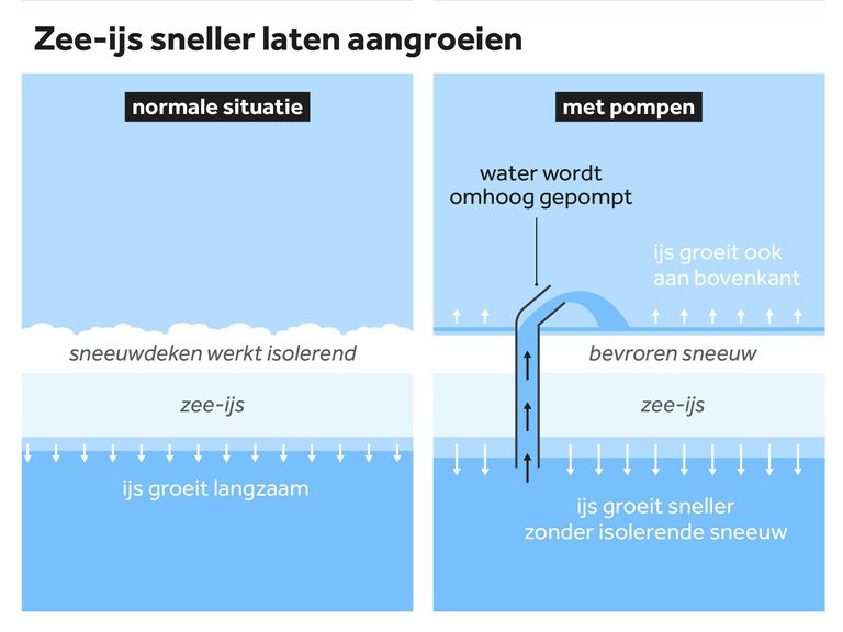 Schematisch weergave van de aanpak van Arctic Reflections om het zee-ijs dikker te maken