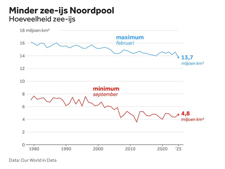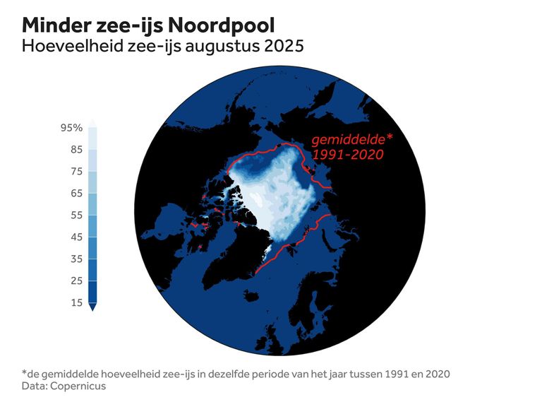 De hoeveelheid ijs aan het einde van de zomer van 2025 ten opzichte van de omvang in het verleden -