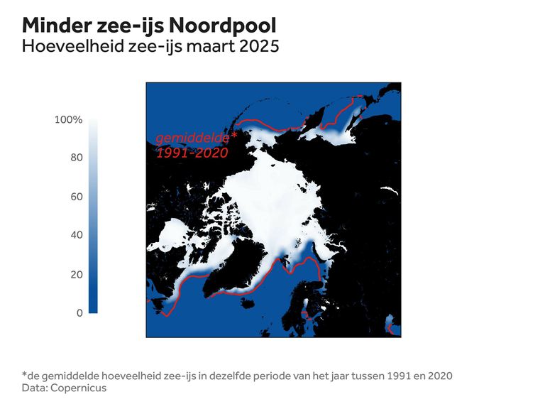 De hoeveelheid ijs aan het einde van de winter van 2025 ten opzichte van de omvang in het verleden -
