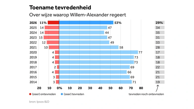 De waardering voor de manier waarop koning Willem-Alexander zijn koningschap invult neemt na de flinke dip in de coronaperiode geleidelijk weer toe. Wel vindt de helft van de Nederlanders het koningshuis te duur. Dat blijkt uit de NOS Koningsdag-enquête 2026, uitgevoerd door onderzoeksbureau Ipsos I&O.