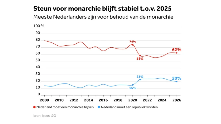 De steun voor de monarchie blijft stabiel. Net als vorig jaar geven zes op de tien de voorkeur aan de monarchie boven een republiek met een gekozen president.