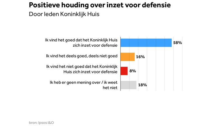 Dat koning Máxima en prinses Amalia het afgelopen jaar actief zijn geworden bij defensie kan rekenen op de steun van bijna 60 procent. Koningin Máxima heeft zich aangemeld als reservist bij de landmacht en Amalia volgt een opleiding bij het Defensity-college.