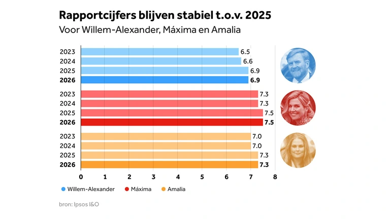 Nederlanders geven de koning net als vorig jaar een 6,9 als rapportcijfer. Koning Máxima en prinses Amalia scoren net als in 2025 iets hoger dan de koning.