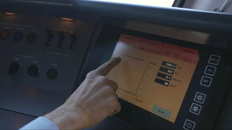 “Kijk”, wijst machinist Martijn de Jong naar een scherm in de cabine van de intercity van Den Bosch naar Utrecht Centraal. “We rollen nu met 110 kilometer per uur door Houten heen, maar we gebruiken geen stroom meer.”