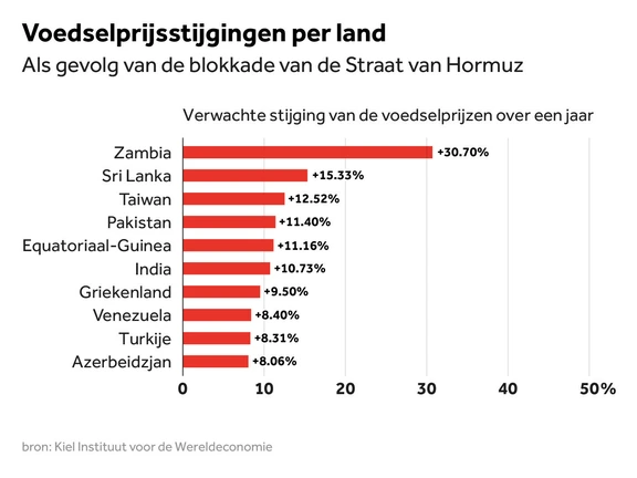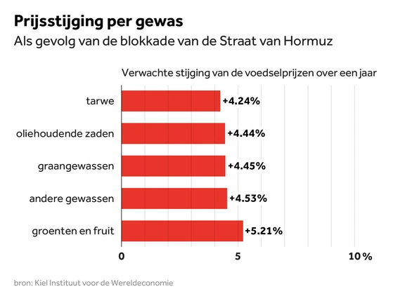 In deze grafieken zie je wat er zou gebeuren met de voedselprijzen als de Straat van Hormuz ongeveer een jaar gesloten blijft: