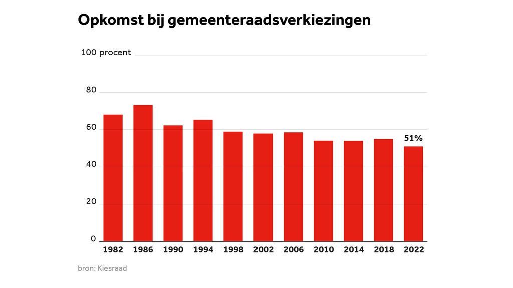 De opkomst voor de gemeenteraadsverkiezingen, die morgen worden gehouden, laat al jaren een dalende trend zien. Waar in 1986 nog bijna driekwart van de kiesgerechtigden naar de stembus ging, was dit bij de verkiezingen in 2022 teruggelopen tot 51 procent.