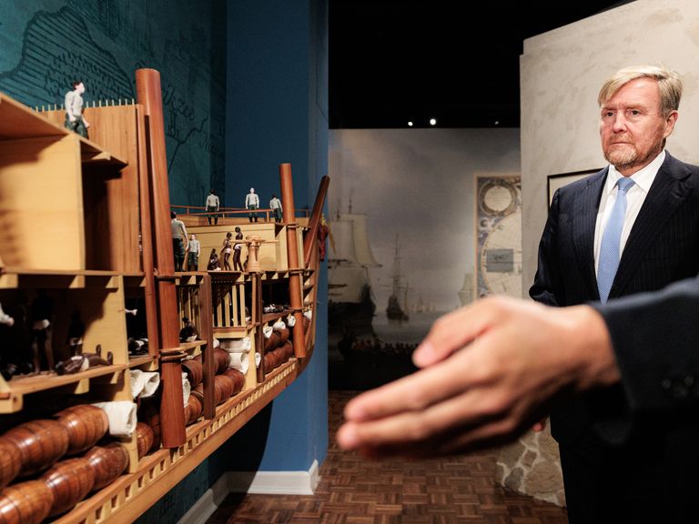 De koning bij een nagebouwd slavenschip -