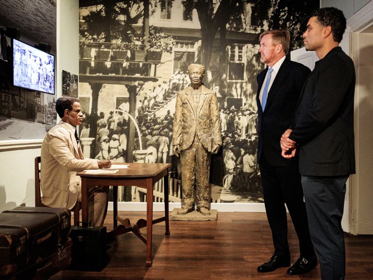 De koning bij een beeld van schrijver, antikoloniaal activist en verzetsheld Anton de Kom -