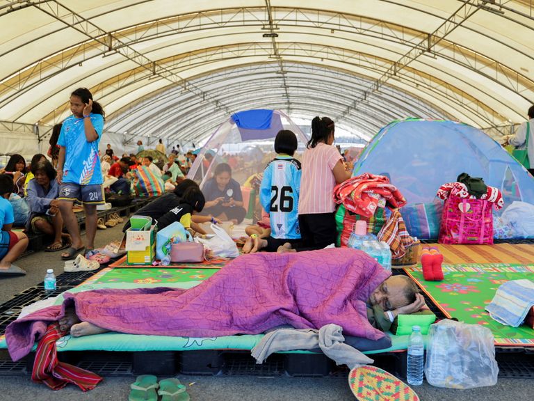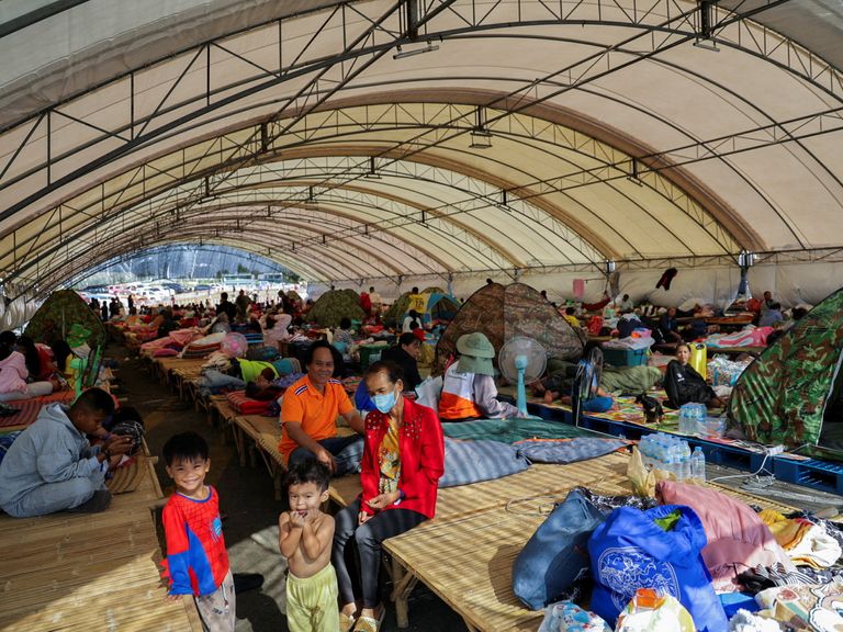 Mensen rusten uit in een opvangcentrum in de Thaise provincie Buriram