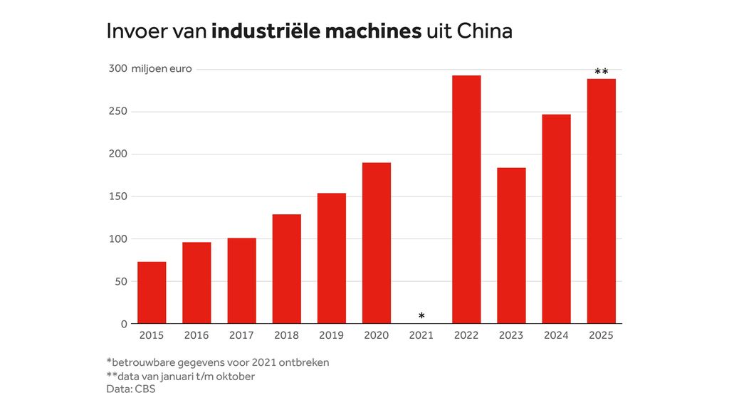 Neem bijvoorbeeld industriële machines. Al jaren zet China in op de productie daarvan, want door de vergrijzende bevolking zal het land snel een tekort aan menskracht hebben. Tien jaar geleden werd de sector zelfs aangewezen als een centrale pijler van China’s economische en strategische ambities. Volgens Chinese staatsmedia groeide het aantal machinebedrijven van 92.000 (in 2020) naar 137.000 (in 2025).