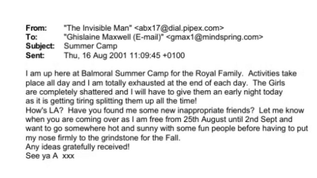 Naast de stukken over Trump zijn er ook opvallende berichten van een “A op Balmoral” uit augustus 2001, die schrijft “op zomerkamp met de koninklijke familie” te zijn en is “uitgeput van alle activiteiten de hele dag door”.