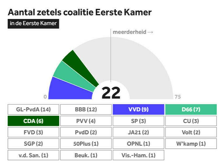 Bikker: “Uiteindelijk heeft het kabinet een gat.” Dat gat is het verschil tussen de 66 Tweede Kamerzetels van de drie regeringspartijen en de 76 zetels die nodig zijn voor een Kamermeerderheid. Ook in de Eerste Kamer heeft de coalitie geen meerderheid.