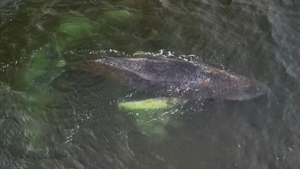 Het gestrande dier trekt veel bekijks en de waterpolitie heeft al verschillende mensen teruggestuurd die naar de bultrug wilden varen.